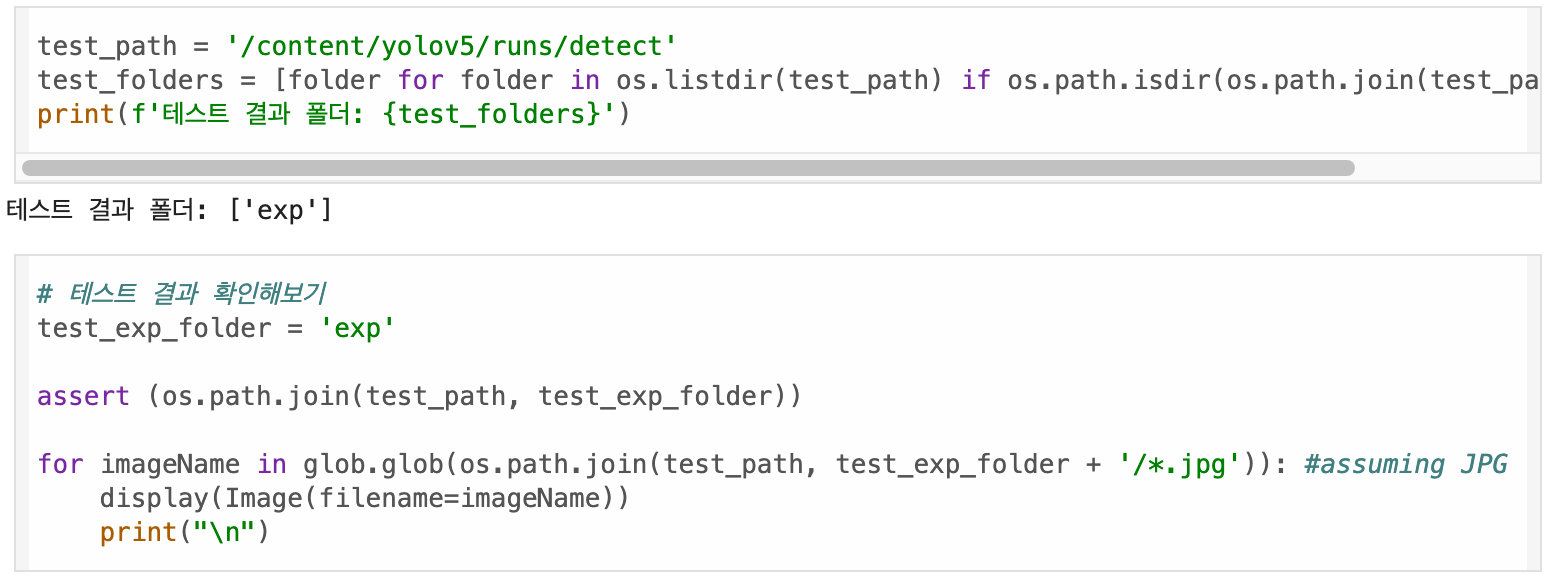 - ํ ์คํธ๊ฐ ์๋ฃ๋ ๊ฒฐ๊ณผ๋ yolov5/runs/detect ์์ ํ์ธํ ์ ์์ผ๋ฉฐ, ํ ์คํธ ๊ฒฐ๊ณผ๋ฅผ ํ์ธํด ๋ณด๊ธฐ ์ํด ์๊ฐํ๋ฅผ ์งํํฉ๋๋ค.