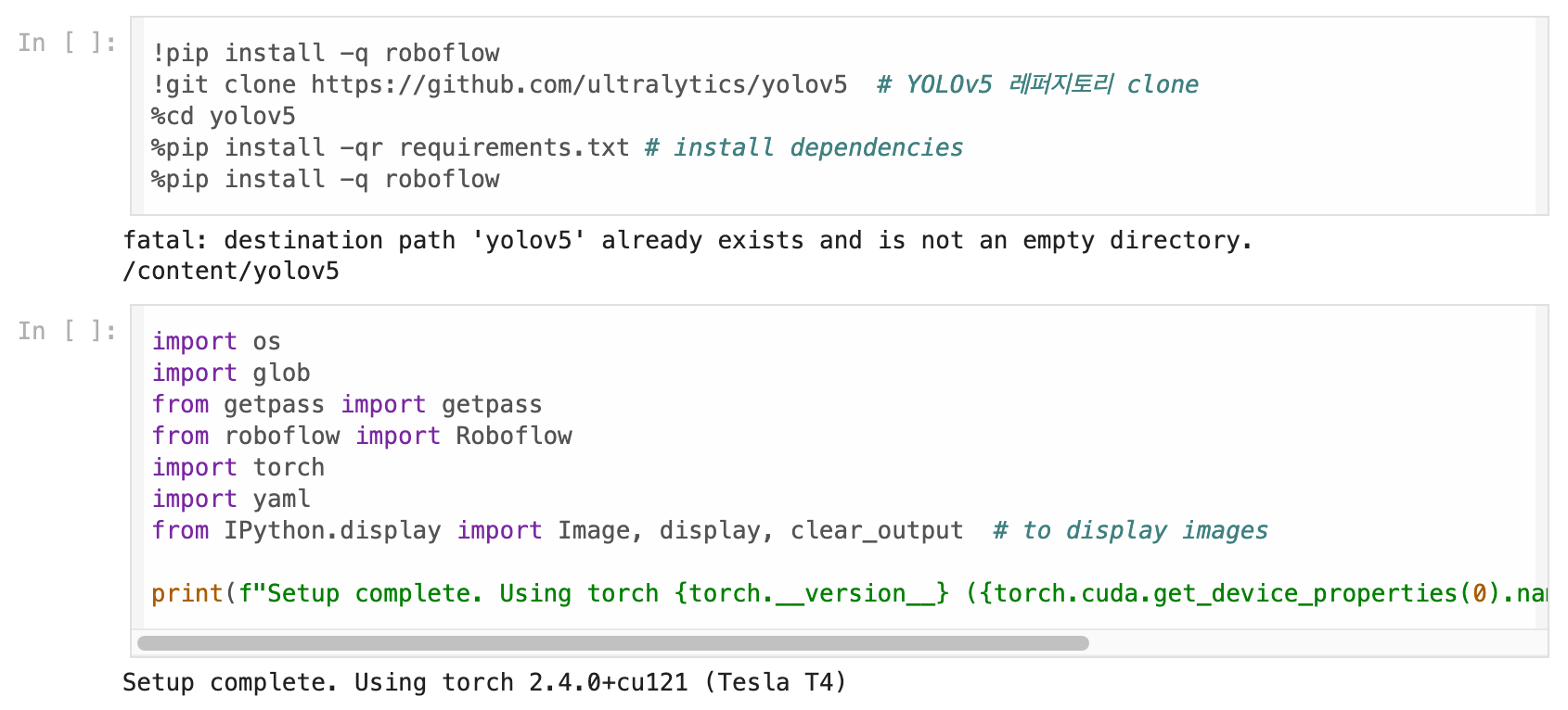 - ์ ์ฝ๋ ๋ธ๋ญ์ roboflow์ yolov5๋ฅผ ์ค์นํ๊ณ ์ํฌํธํ๋ ์ฝ๋์์.