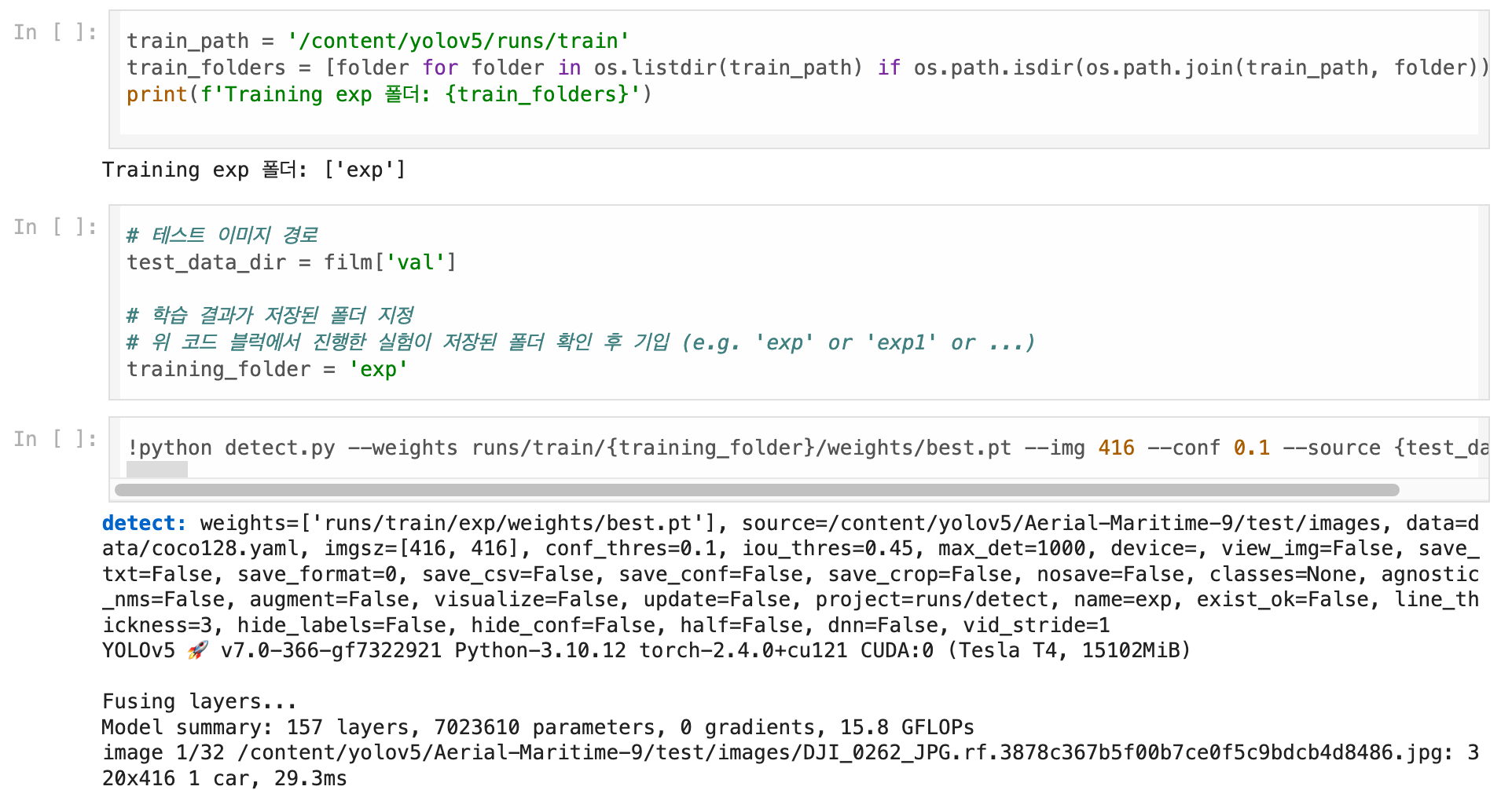 - yolov5/runs/train ๊ฒฝ๋ก์์ ํ์ต๋ ๋ชจ๋ธ์ ๊ฒฐ๊ณผ๋ฅผ ํ์ธํ ์ ์์ผ๋ฉฐ, ์ฌ๊ธฐ ์ ์ฅ๋ ๋ชจ๋ธ ์จ์ดํ ๋ถ๋ฌ์์ ํ ์คํธ ๋ฐ์ดํฐ์ ์ ์ธํผ๋ฐ์ค๋ฅผ ์งํ ํฉ๋๋ค.