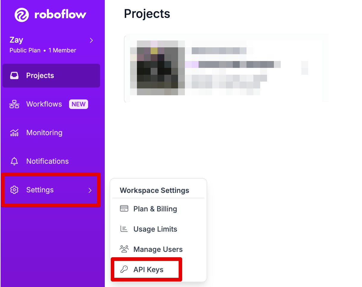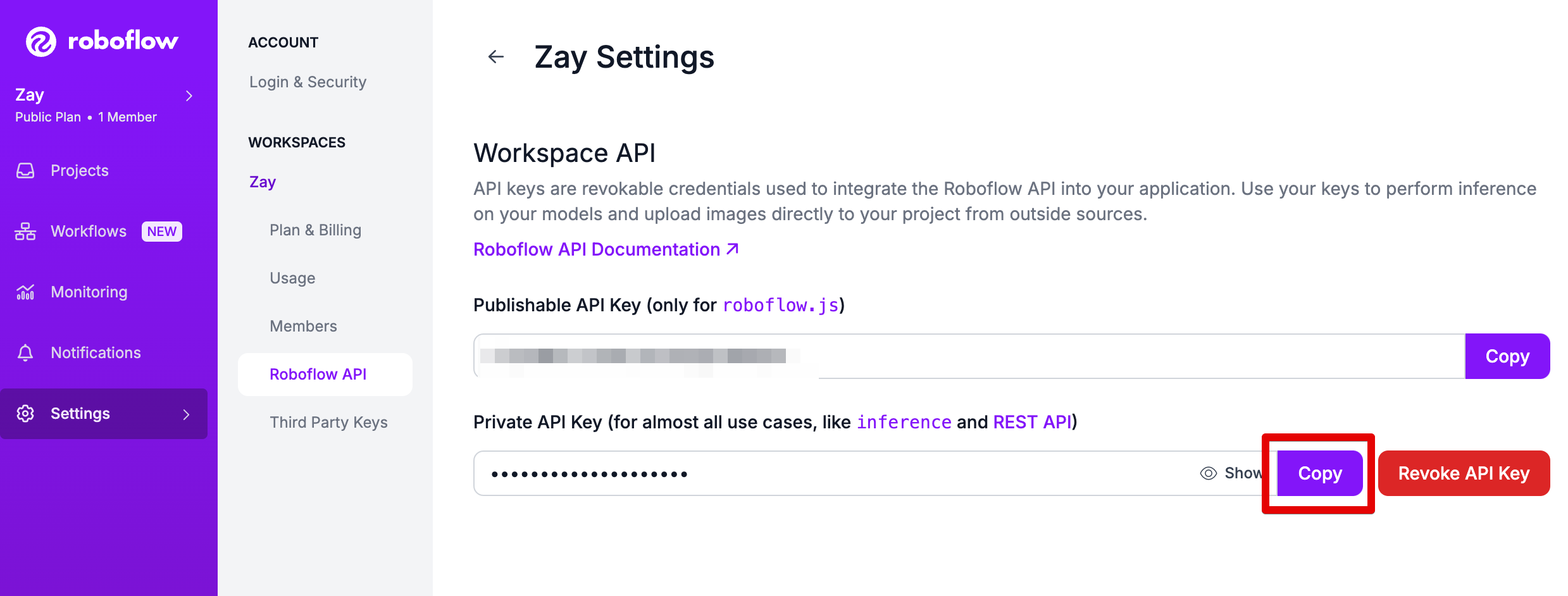 - api key๋ roboflow์ ๋ก๊ทธ์ธ ํ์๊ณ Setting > API Keys > Private API Key์์ ํ์ธํ ์ ์๊ณ ,Copy๋ฅผ ๋๋ฅด๋ฉด ๋ณต์ฌ๊ฐ ๋ผ์.