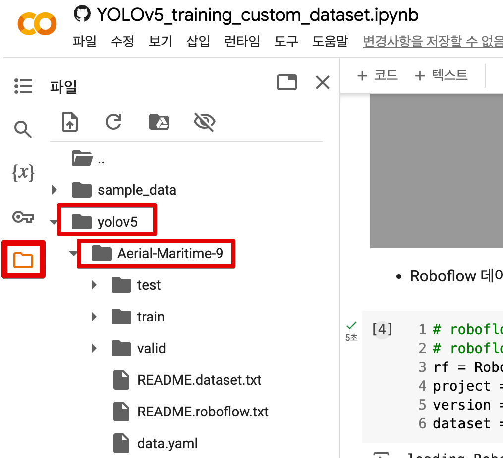 - ์ฝ๋ฉ์ ์ข์ธก ํด๋ ์์ด์ฝ์ ๋๋ฅด๋ฉด ์ค์นํ yolov5 ํด๋ ์์ Aerial-Maritime-9 ๋ฐ์ดํฐ์ ์ด ๋ค์ด๋ก๋๋ ๊ฑธ ํ์ธํ ์ ์์ด์!