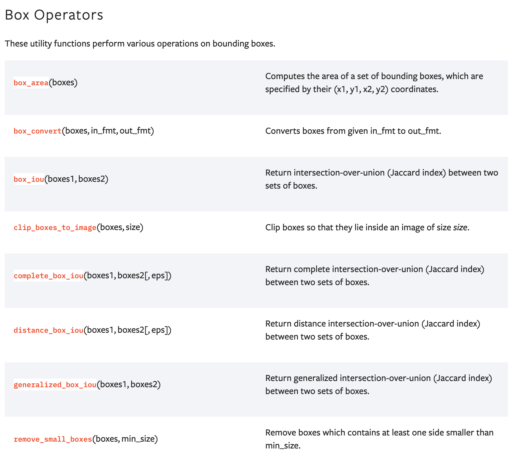 torchvision.ops 에서는 computer vision 관련 각종 operator 들을 제공하는데, 그중에서 Bounding Box를 다루는 Box Operators를 소개한다. Detection 관련 코드를 만지다보면 bounding box를 다룰 일이 많은데, torchvision.ops 에서는 bactch 단위로 연산이 가능한 각종 기능들을 제공한다.