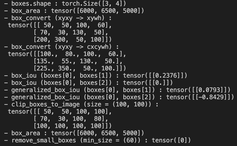 * box 면적, box간의 iou, box format 변경, clip 등 수행 가능