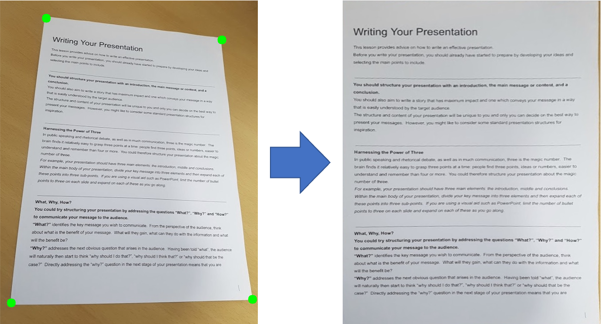 ๊ทธ ์ค์์ ๊ฐ์ฅ ํฐ ์์ ๋๋ฅผ ๊ฐ์ง๋ perspective transformation์ ์ฌ์ฉ๋ฒ์ ๋ํด ์์๋ณด๋ ค ํ๋ค. ์ฐ๋ฆฌ๊ฐ ๊ฐ์ฅ ํํ๊ฒ ์ ํ ์ ์๋ perspective transformation์ ์์๋ ๋ฌธ์๋ฅผ ์ดฌ์ํ๋ฉด ๋ฌธ์์ ๋ชจ์๋ฆฌ๋ฅผ ์ฐพ์์ ์ ๋ฉด์ผ๋ก ๋ณด๋ view๋ก ๋ณํํด ์ฃผ๋ ๊ธฐ์ ์ด๋ค. ์ค๋งํธํฐ ์ค์บ ์ดํ ๋ฑ์์ ํํ ๋ณผ ์ ์๋ค.