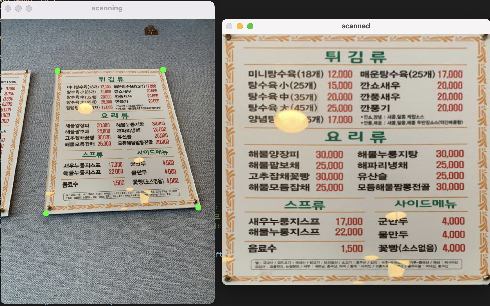 - ํด๋ฆญํ ๋ชจ์๋ฆฌ 4๊ณณ์ผ๋ก ๋ณํ ํ๋ ฌ์ ๊ณ์ฐํ๊ณ ๋ณํ ํ๋ ฌ๋ก perspective transformation ๋ ์ด๋ฏธ์ง ์ถ๋ ฅ