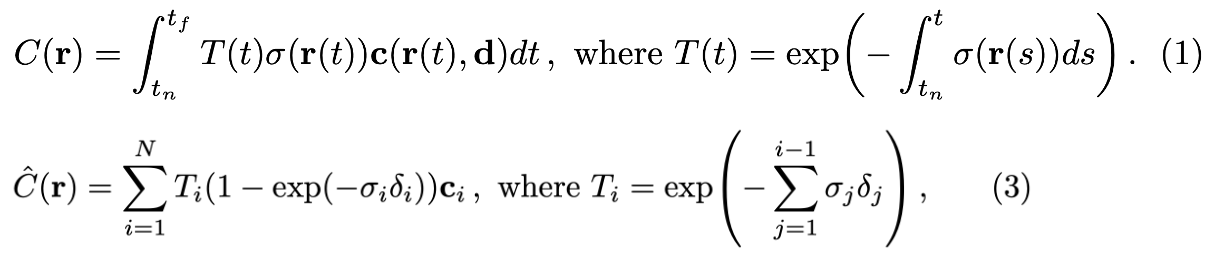 ์๋กญ๊ฒ ์์ฑํ๊ณ ํ view์ ๊ฐ์์ ์นด๋ฉ๋ผ ์ค์ฌ์ผ๋ก๋ถํฐ ๊ฐ์ฒด ํฅํด ray๋ฅผ ์ด์ ์ด๋ฌํ ray์์ ์ฌ๋ฌ ํฌ์ธํธ๋ค์ ์ํ๋งํ๊ณ ((a)์์ ray์์ ๊ฒ์์ ์ ๋ค), MLP๋ฅผ ํตํด ํด๋น ์ขํ์ RGB์ density ๊ฐ์ ์์ธกํ๋ค. ์ด ๋ ๊ฐ์ฒด๊ฐ ์๋ ์์น๋ density๊ฐ ๋ฎ๊ฒ ๋์ฌ ๊ฒ์ด๊ณ ๊ฐ์ฒด๊ฐ ์กด์ฌํ๋ ์์น์ density๋ ๋๊ฒ ๋์ฌ ๊ฒ์ด๋ค. ์ด ray์์ ์ํ๋ง๋ ๋ชจ๋ ํฌ์ธํธ๋ค์ RGB, density ๊ฐ์ ๋ค์ ๋ฐ๋ผ๋ณด๋ ์์ ์ผ๋ก projection ์ํค๊ณ ํน์ ์ฐ์ฐ์ ํตํด ์ ์ ํ ์ต์ข ์ปฌ๋ฌ๊ฐ์ ๊ณ์ฐํ๋ค. (ray๊ฐ ์ฒซ ๋ฒ์งธ๋ก ๋ง๋๋ ๊ฐ์ฒด์ ๋ ๋ง์ ๊ฐ์ค์น๊ฐ ์๋๋ก ์ฐ์ฐ)