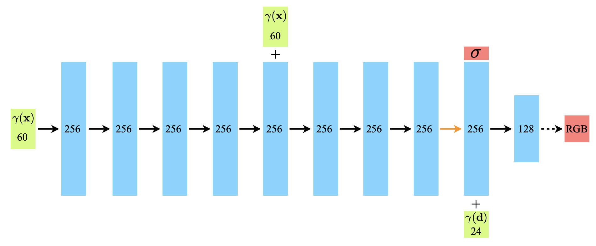 ์ํคํ ์ฒ๋ฅผ ๋ณด๋ฉด ์ฌ์ค ๋ ๋ณ๊ฑฐ ์๋ค. MLP ์ ๋ ฅ๋จ์์ x(์์น ์ ๋ณด(x,y,z))๊ฐ ์ ๋ ฅ๋๊ณ 5๋ฒ ์งธ layer์์ ํ ๋ฒ๋ concatํด์ ์ ๋ ฅ๋๋ค. skip connection์ ์ผ์ข ์ด๋ผ ๋ณผ ์ ์๋ค. ๊ทธ๋ฆฌ๊ณ 9๋ฒ ์งธ layer์์ density(๐)๊ฐ ์ถ๋ ฅ๋๊ณ , ์ฌ๊ธฐ์ ๋ค์ d(๋ฐฉํฅ ์ ๋ณด(๐ณ,๐))๊ฐ ์ ๋ ฅ๋์ด ์ต์ข ์ ์ผ๋ก RGB ๊ฐ์ด ์ถ๋ ฅ๋๋ค.