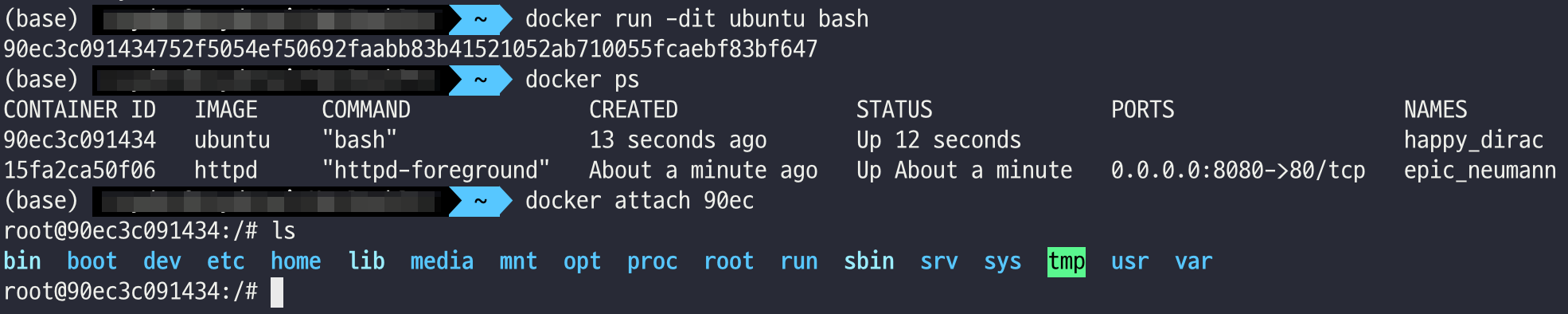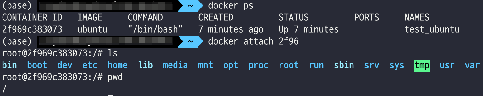 - docker ps๋ก ํ์ธํ์ ๋, ubuntu์ COMMAND๊ฐ "bash" ์ด๊ธฐ์ docker attach๋ก ๋ฐ๋ก ์ปจํ ์ด๋์ ์ ์ ๊ฐ๋ฅ