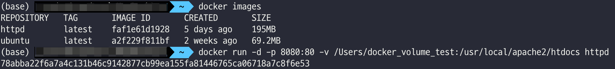 docker run -d -p 8080:80 -v /Users/docker_volume_test:/usr/local/apache2/htdocs httpd