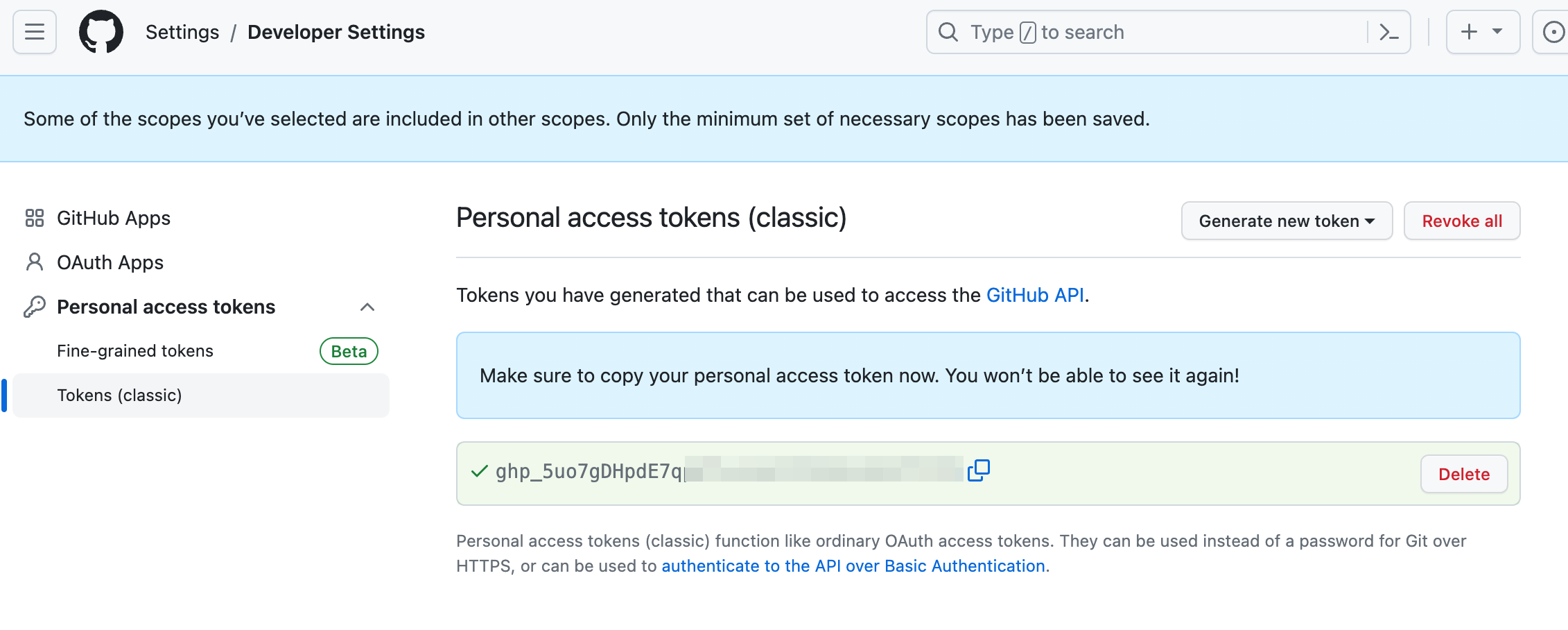 - ๊นํ๋ธ → Settings → Developer Settings → Personal access tokens ์์ ๊ฐ์ธ ํ ํฐ ์์ฑ