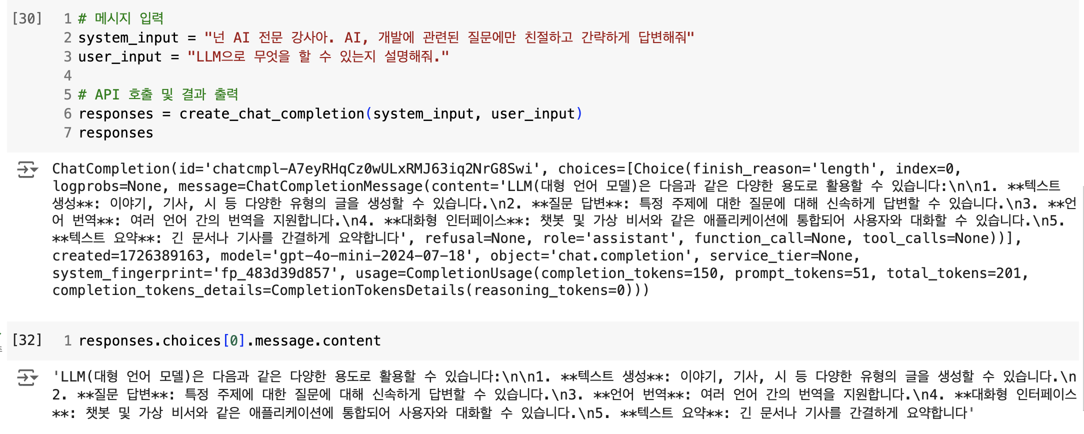 - ์๋ต์ ๋ด์ฉ์ responses.choices[0].message.content์ ๋ค์ด ์์ด์.