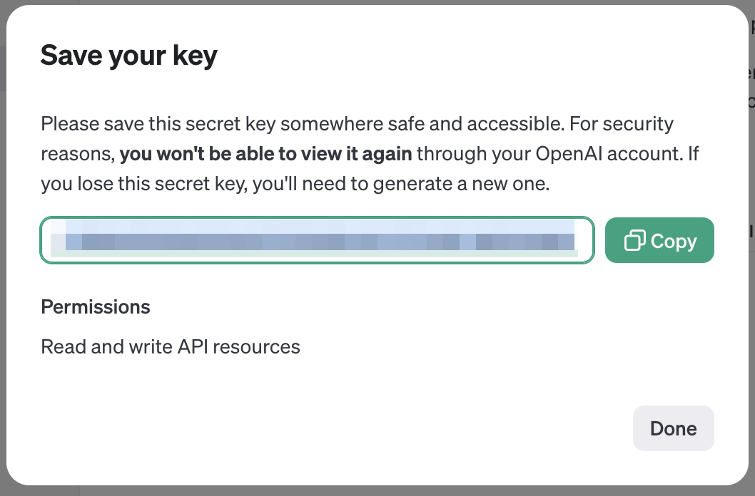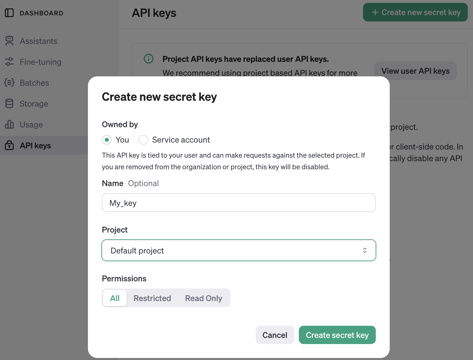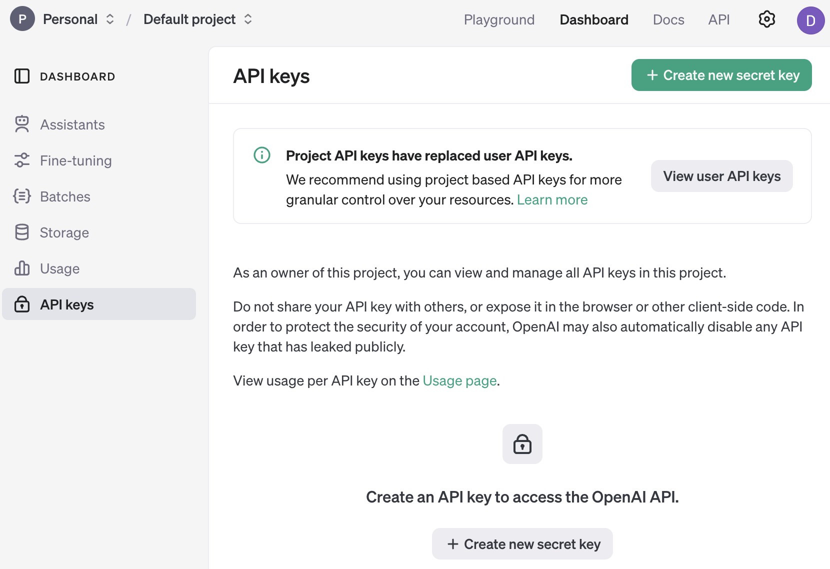 OpenAI ์ ๋ฃ ๊ฒฐ์ ๋ฅผ ํ์ จ๋ค๋ฉด, OpenAI Platform์์ ๋ก๊ทธ์ธ ํ, API ํค๋ฅผ ๋ฐ๊ธ๋ฐ์ผ์ ์ผ ํด์!