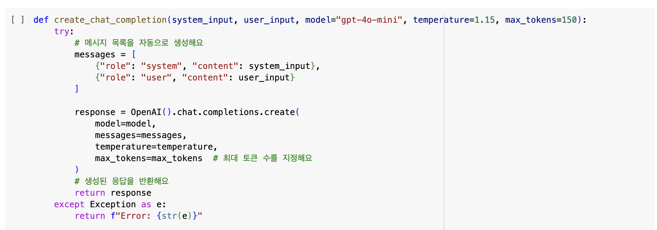 - system_input๊ณผ user_input์ ์ ์ํ๊ณ , create_chat_completion ํจ์๋ฅผ ํธ์ถํฉ๋๋ค.