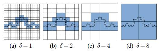 box counting은 이미지에 box 사이즈를 바꿔가며 몇개의 box가 필요한지 카운팅 후 log scale로 맵핑 후 least square regression을 통해 dimension을 계산합니다.