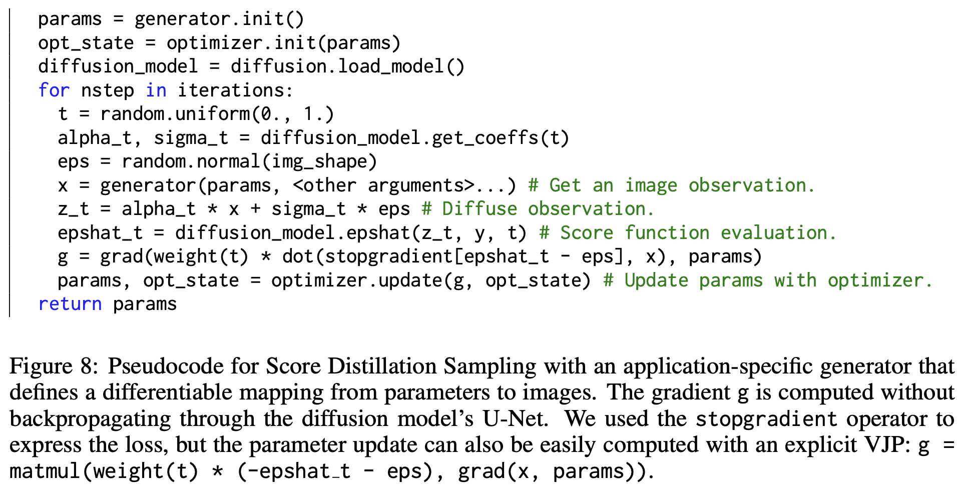 DreamFusion์ ์ต์ข ํ์ต ๋ฃจํ๋ ๋ค์๊ณผ ๊ฐ๋ค.