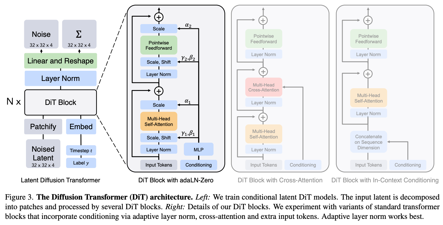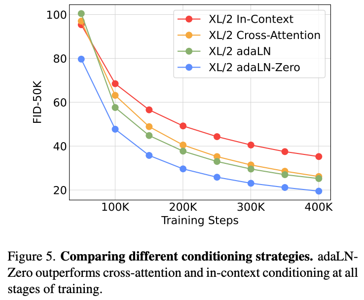 논문에서는 transformer를 diffusion backbone으로 사용하면서 conditioning(조건 주입)을 어떻게 하면 가장 효과적인지 다양한 방법을 실험했다.