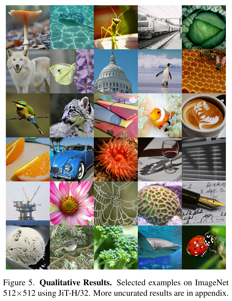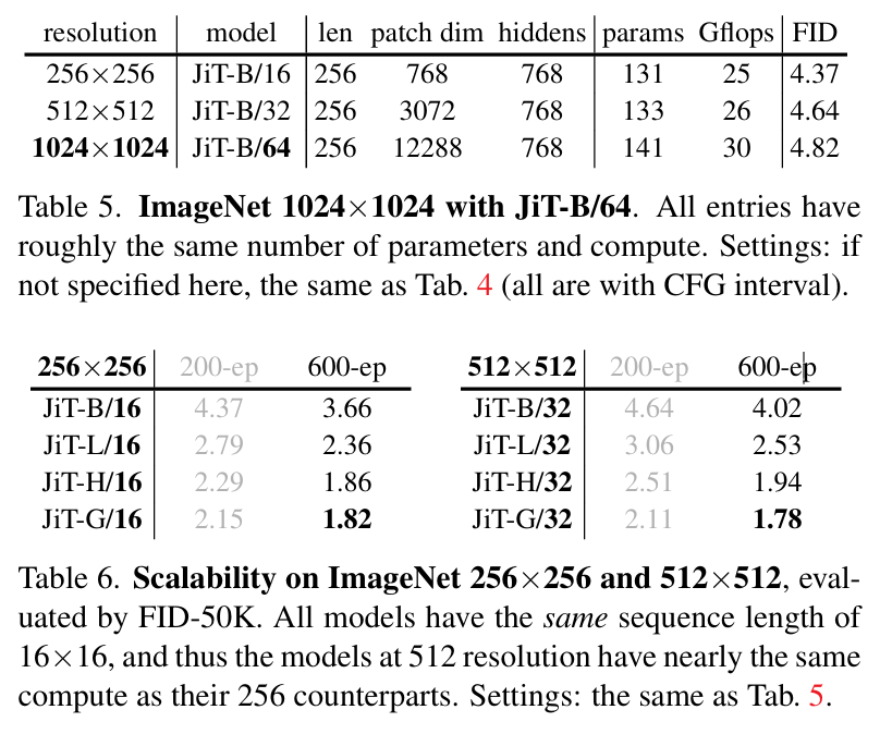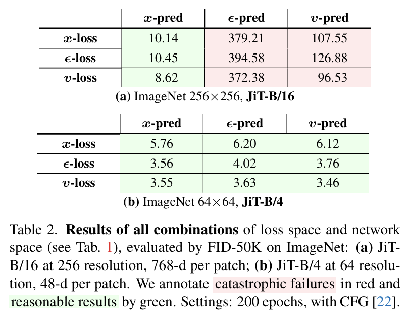 - 256×256 pixel-space์์ ฯต/v prediction์ ์์ ํ ๋ถ๊ดดํ์ง๋ง, x-prediction์ ์ ์ ์๋ํ๋ค. (Table 2(a))