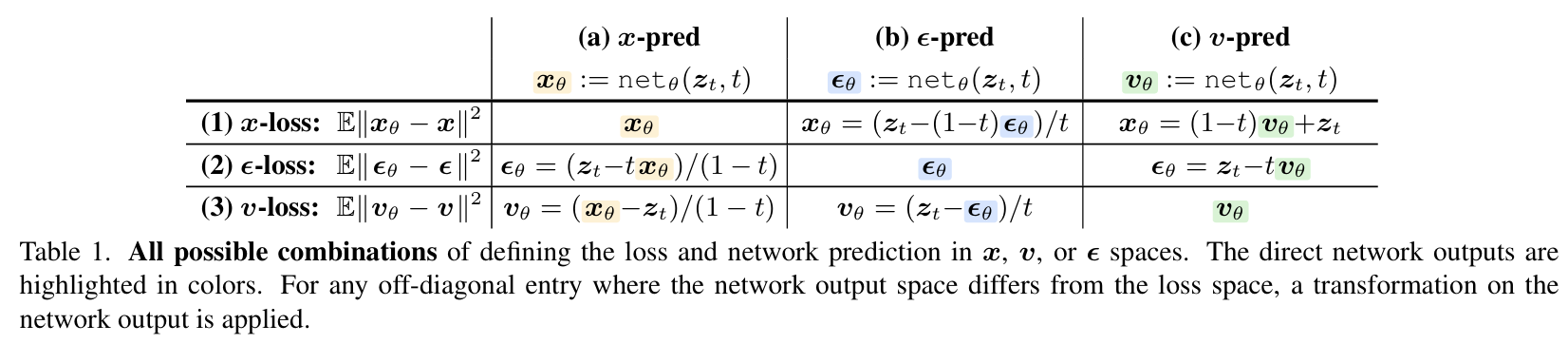 ๋ ผ๋ฌธ์์๋ x, ฯต, v ์ธ ๊ฐ์ง๋ฅผ prediction target์ผ๋ก ๋ ์ ์์ผ๋ฉฐ, ์ด๋ฅผ loss space์ ์กฐํฉํ๋ฉด ์ด 9๊ฐ์ง ๊ฒฝ์ฐ๊ฐ ๋๋ค๊ณ ์ ๋ฆฌํ๋ค. (Table 1) ์ธ ๊ฒฝ์ฐ๋ ์๋์ ๊ฐ์ ์ฑ๊ฒฉ์ ๊ฐ์ง๋ค.