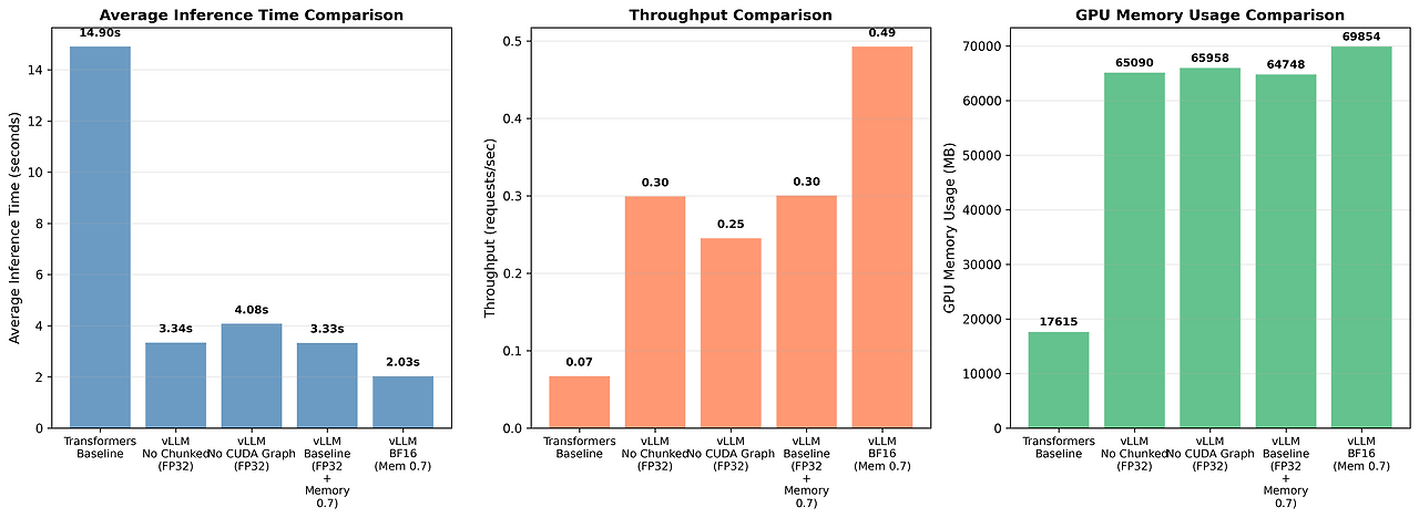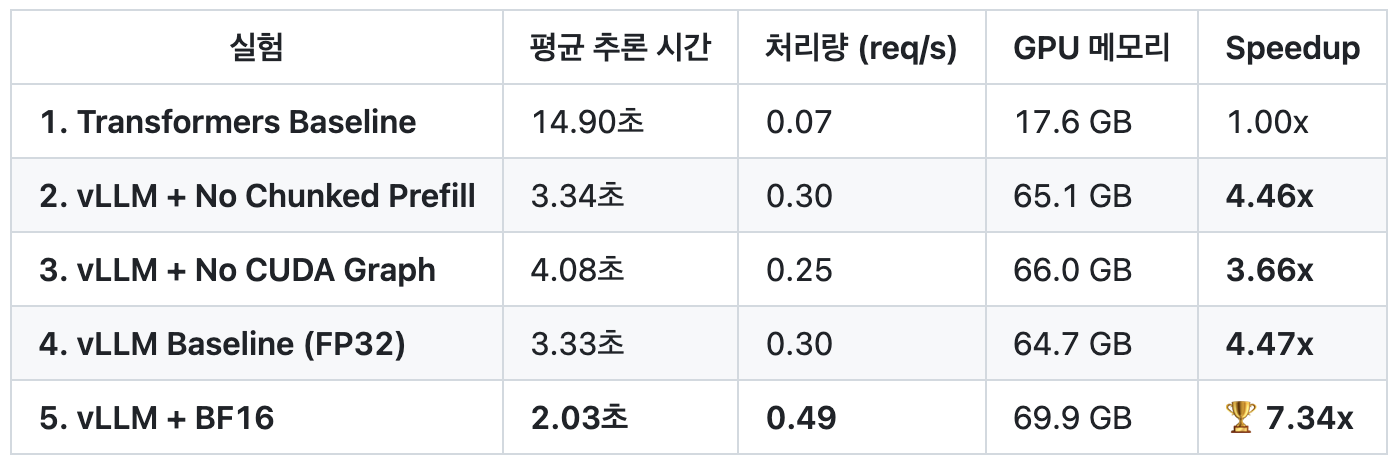 vLLM ๊ธฐ๋ณธ ์ค์ ๋ง์ผ๋ก๋ ์ฝ 4.5๋ฐฐ์ ์ฑ๋ฅ ํฅ์์ด ๋ํ๋ฌ์ผ๋ฉฐ, BF16 ์ ์ฉ ์ 7๋ฐฐ ์ด์์ ๊ฐ์์ ๋ฌ์ฑํ๋ค.