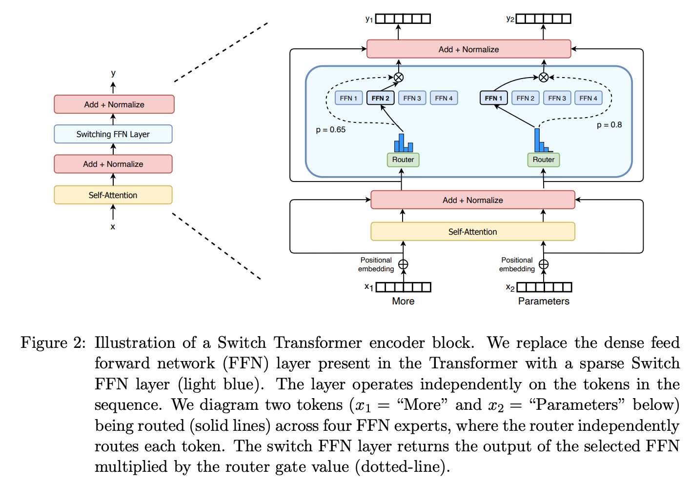 - ์ ํ๋ expert๋ง ํด๋น ํ ํฐ์ ๋ํด FFN ๊ณ์ฐ์ ์ํํ๋ค.