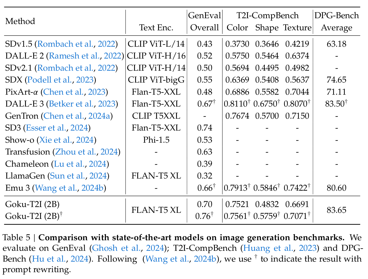 - Table 5์์ Goku-T2I(2B)๋ T2I-CompBench์ color/shape/texture ์ถ์์ ๊ฒฝ์๋ ฅ ์๋ ์์น๋ฅผ ๋ณด์ด๊ณ , DPG-Bench์์ 83.65๋ฅผ ๋ณด๊ณ ํ๋ค(ํ ๋ด ํ๊ท ์ ์).