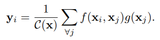 - g(xj) : j ๋ฒ์งธ ์์น์ feature์ weight๋ฅผ ๊ณฑํด์ embeddingํ๋ ํจ์์ด๋ฉฐ, ๋จ์ํ ํน์ ์์น์ feature๋ฅผ ๊ฐ์ ธ์ค๋ ๋์ weight๋ฅผ ๊ณฑํด์ฃผ์ด ์๋ฏธ์๋ ์ ๋ณด๋ฅผ ์ถ์ถํ๋ ค ํฉ๋๋ค. ๊ณฑํด์ง๋ ํจ์ f๋ฅผ weight๋ก ์๊ฐํ๋ฉด i, j ๊ฐ์ similarity ๊ฐ ๋์ ๋ g(xj)๊ฐ ๋ ํฌ๊ฒ activate ๋ฉ๋๋ค.