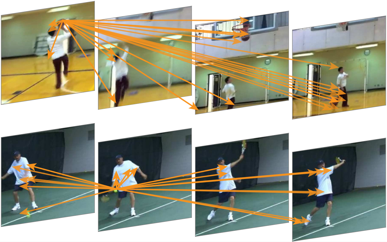 ์๋ ๊ทธ๋ฆผ์ non-local block ์ด ํ์ต๋์์ ๋, ๊ฐ์ฅ ํฐ weighted arrow ๋ฅผ ์๊ฐํํ ๊ทธ๋ฆผ์ ๋๋ค. ํน์ object๊ฐ ๋ค๋ฅธ object์ correlation์ด ์๋ค๋ฉด spatial, temporal ๊ฑฐ๋ฆฌ๊ฐ ๋ฉ๋๋ผ๋ ํฌ๊ฒ activate ๋๋ ๊ฒ์ ํ์ธํ ์ ์์ต๋๋ค.