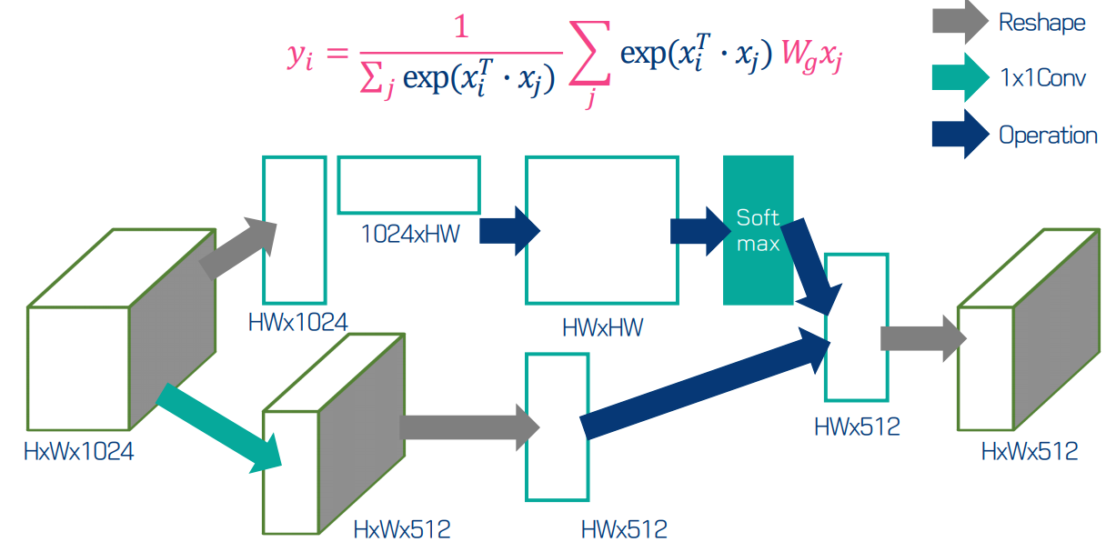 feature x(HW*1024)๋ฅผ transposeํด์(1024*HW) ์๋ก matrix multiplication ์ฐ์ฐ(f(xi,xj))์ ํตํด similarity ์ ๊ณ์ฐํฉ๋๋ค(HW*HW). ๋ค์ feature x๋ฅผ 1x1 conv(g(xj))๋ฅผ ํต๊ณผ์์ผ embedding ์์ผ์ฃผ๊ณ (HW*512), ์ด๋ฅผ ์์ ์ฐ์ฐ์์ ์ถ๋ ฅํ similarity map(HW*HW)๊ณผ matrix mul. ๋ฅผ ์ํํด์ non-local ์ฐ์ฐ์ด ๋๋ฉ๋๋ค.