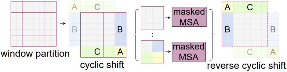 ์์ ์์๋ฅผ ๊ธฐ์ค์ผ๋ก W-MSA๋ 4๊ฐ์ window์์ self attention์ ๊ฐ๊ฐ ์ํํ๊ณ , SW-MSA๋ 9๊ฐ์ window์์ self attention์ ๊ฐ๊ฐ ์ํํด์ผ ํฉ๋๋ค. 9๊ฐ๋ฅผ ๊ฐ๊ฐ ์ํ ์ padding์ ์ด์ฉํ ์ ์์ง๋ง computation cost๊ฐ ์ฆ๊ฐํ๊ธฐ ๋๋ฌธ์ ๋ณธ ๋ ผ๋ฌธ์์๋ ‘cyclic shift’(figure 7) ๋ผ๋ ๋ฐฉ๋ฒ์ ์ฌ์ฉํฉ๋๋ค. ์๋์ฐ๋ฅผ window size//2 ๋งํผ(์์์์๋ 2๋งํผ) ์ฐ์ธก ํ๋จ์ผ๋ก ์ด๋์ํค๊ณ ์ข์ธก ์๋ด์ A, B, C ๊ตฌ์ญ์ ์ฐ์ธกํ๋จ์ผ๋ก ์ด๋์ํต๋๋ค. ๊ทธ๋ฆฌ๊ณ 4๊ฐ๋ก ๋๋์ด์ง window ์์ ๊ฐ๊ฐ self attention์ ์ํํ๋๋ฐ 2์ฌ๋ถ๋ฉด์ window ๋ฅผ ์ ์ธํ๊ณ ๋ ์ด๋ฏธ์ง space์์ ์ฐ๊ฒฐ๋ ๋ถ๋ถ์ด ์๋๊ธฐ ๋๋ฌธ์ ๊ฐ๊ฐ ๋ค๋ฅธ mask๋ฅผ ์์์ ์ด๋ฏธ์ง space์์ ์ฐ๊ฒฐ๋ patch๋ค๊ฐ์ self attention์ ์ํํ์ฌ computation cost๋ฅผ ์๊ฒ ๋ง๋๋ ํจ๊ณผ๋ฅผ ๊ฐ์ ธ์ต๋๋ค. ์๋ figure 8๋ cyclic shift + Masked MSA์ ์์์ ๋๋ค.