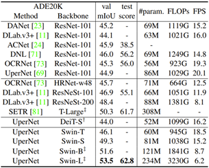 Swin Transformer๋ ViT ์ ๋ฌธ์ ์ ์ด์๋ ๋ง์ ๊ณ์ฐ๋๊ณผ ์ด๋ฏธ์ง resolution, scale์ variation์ด ๊ณ ๋ ค๋์ง ์์๋ ์ (์ ์ inductive bias)์ ๊ฐ์ ํ๊ณ ์ฌ๋ฌ object detection, segmentation method์ backbone์ผ๋ก ์ฌ์ฉํ ์ ์์ต๋๋ค. Segmentation dataset์ธ ADE20K์ benchmark๋ฅผ ๋ณด๋ฉด 1~10์๋ ๊ฑฐ์ ๋ชจ๋ method๊ฐ transformer ๊ธฐ๋ฐ์ด๊ณ , ํ์ฌ SOTA๋ Swin Transformer version 2 ์ ๋๋ค.