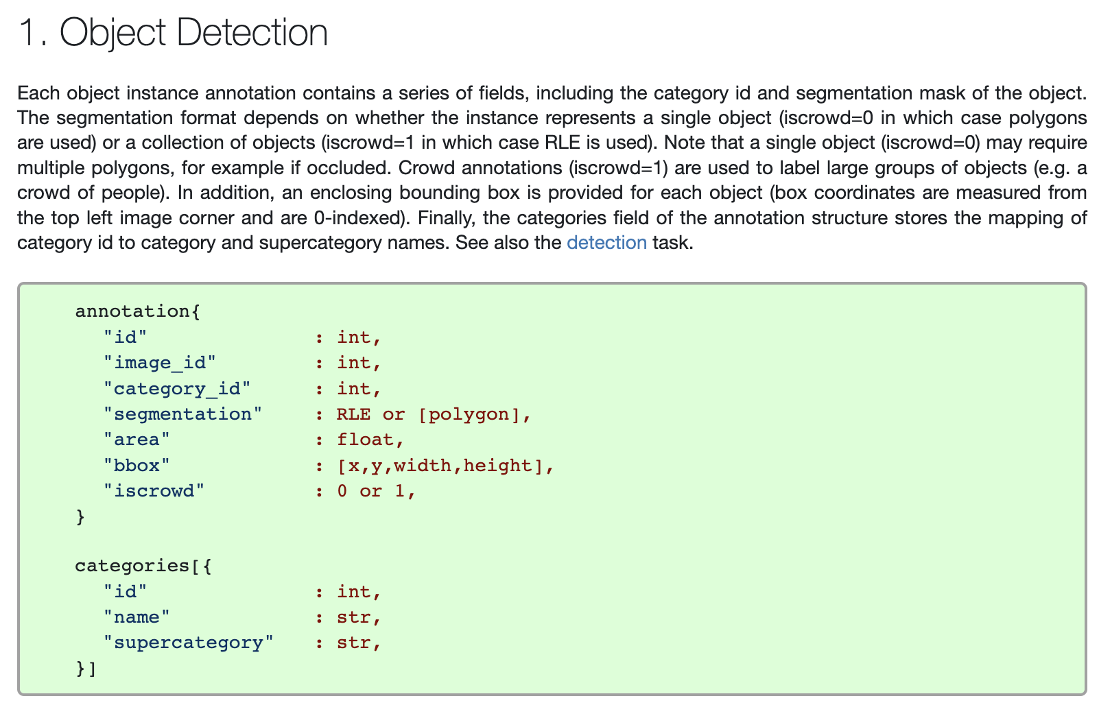 Detection task์์๋ Bounding box์ ์์น์ class label์ด ํ์ํ๊ณ segmentation task ์์๋ segment mask ์ ๋ณด๊ฐ ํ์ํ๋ค. ์ด๋ฌํ annotation ์ ๋ณด๋ค์ json ํํ๋ก ์ ๊ณต๋๊ณ , JSON ํ์ผ์๋ Info, License, Images, Categories, Annotations 5๊ฐ์ง ์ ๋ณด๊ฐ ๋ด๊ฒจ ์๋ค. ์ฃผ์ํ ์ ์ ์ด๋ฏธ์ง ํ๋์ ์ฌ๋ฌ ๊ฐ์ฒด๊ฐ ์กด์ฌํ ์ ์์ผ๋ฏ๋ก annotation ์ ๋ณด๋ ์ฌ๋ฌ๊ฐ ์ผ ์ ์. ๋๋ฌธ์ dataset์ ๋ถ๋ฌ์ฌ ๋ ํ๋์ ์ด๋ฏธ์ง์ ํฌํจ๋ ๋ชจ๋ annotation ์ ๋ณด๋ฅผ ๋ถ๋ฌ์ค๊ณ maskํ ์์ผ์ ground truth ๋ฅผ ๋ง๋๋ ์์ ์ด ํ์ํ๋ค.