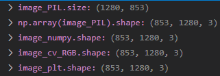- μ¬μ΄μ¦ νμΈμ .size() λ©μλλ‘ νμΈ κ°λ₯νλ°, (W,H)λ‘ μΆλ ₯λ¨. νμ§λ§, numpy array λ‘ λ³νμ (H,W,C)λ‘ λμ€λκΉ μ£Όμ. μ¦, .size()λ‘ νμΈ μμλ§ (W,H)λ‘ λμ€λ κ².